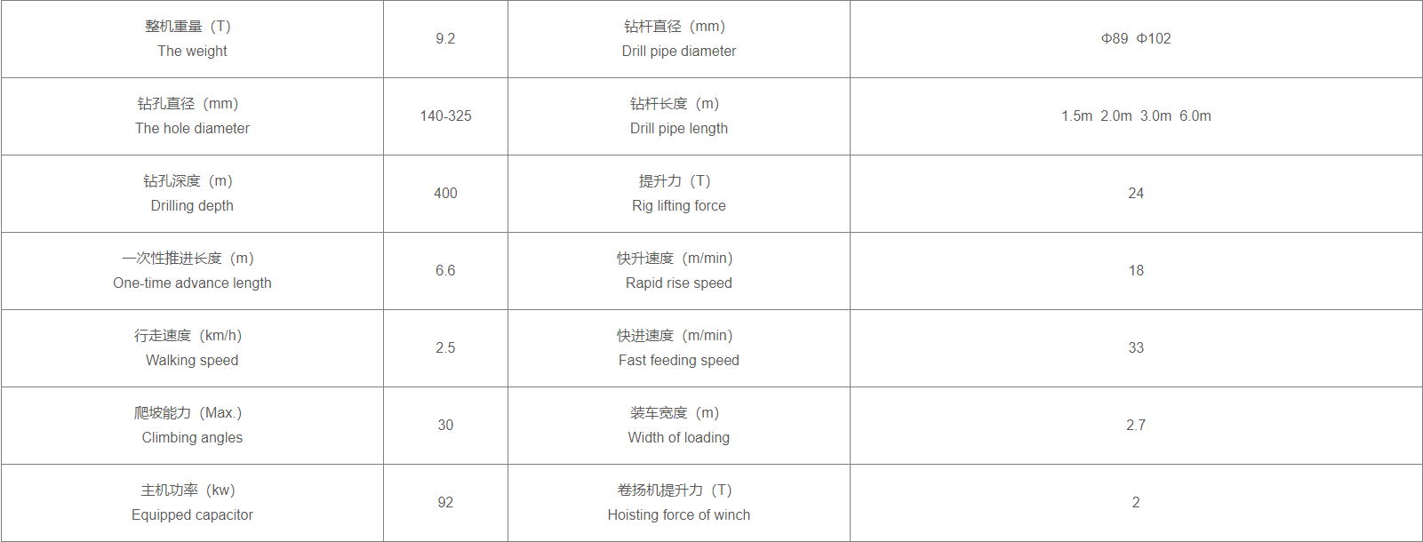 QD400水井钻机特点:1、是一种高效、多功能的井下水井钻井设备,可用于打水井、农灌井、地热井等各类井眼。特别适用于山区和岩层取水工程。 2、本机可在不同地层钻孔(岩石层、泥层、沙层),最大孔径可达300mm。 3、本机采用大扭矩液压马达动力头和品牌柴油,液压控制系统采用大直径液压缸。品牌柴油有2级空气过滤系统保护,也可以直接使用空气压缩机的清洁空气。 4、独特的凸块设计和集中控制的操作系统,易于维护,方便机器操作。 5、本机采用挖掘机履带底盘,越野性能高,也可安装在卡车上,机动性更强。 6、两个齿轮旋转和进给速度使其在土壤和岩石层中工作。 7、可增加双系统:1.空气动力系统搭配空压机2.泥浆泵系统搭配泥浆泵