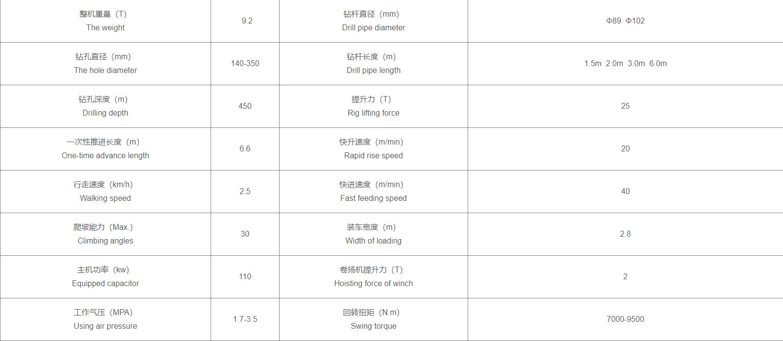 QD450水井钻机特点:1、是一种高效、多功能的井下水井钻井设备,可用于打水井、农灌井、地热井等各类井眼。特别适用于山区和岩层取水工程。 2、本机可在不同地层钻孔(岩石层、泥层、沙层),最大孔径可达450mm。 3、本机采用大扭矩液压马达动力头和品牌柴油,液压控制系统采用大直径液压缸。品牌柴油有2级空气过滤系统保护,也可以直接使用空气压缩机的清洁空气。 4、独特的凸块设计和集中控制的操作系统,易于维护,方便机器操作。 5、本机采用挖掘机履带底盘,越野性能高,也可安装在卡车上,机动性更强。 6、两个齿轮旋转和进给速度使其在土壤和岩石层中工作。 7、独立散热双系统采用液压式油温冷却,搭载传统风冷。发动机寿命长 8、可增加双系统:1.空气动力系统搭配空压机2.泥浆泵系统搭配泥浆泵